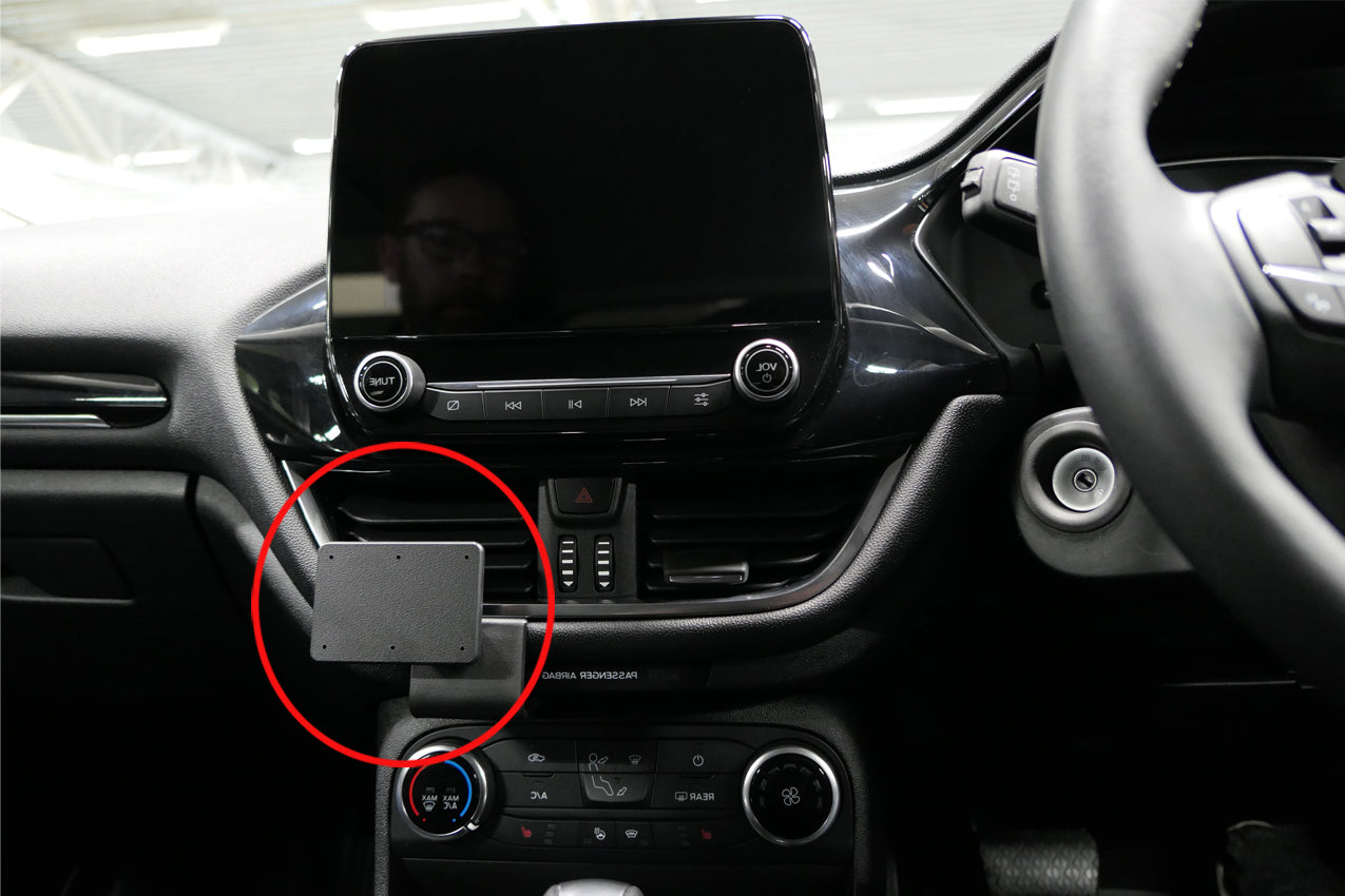 2. Hook the angled edge on the upper part of the ProClip into the gap between the frame surrounding the air vents and the dashboard.