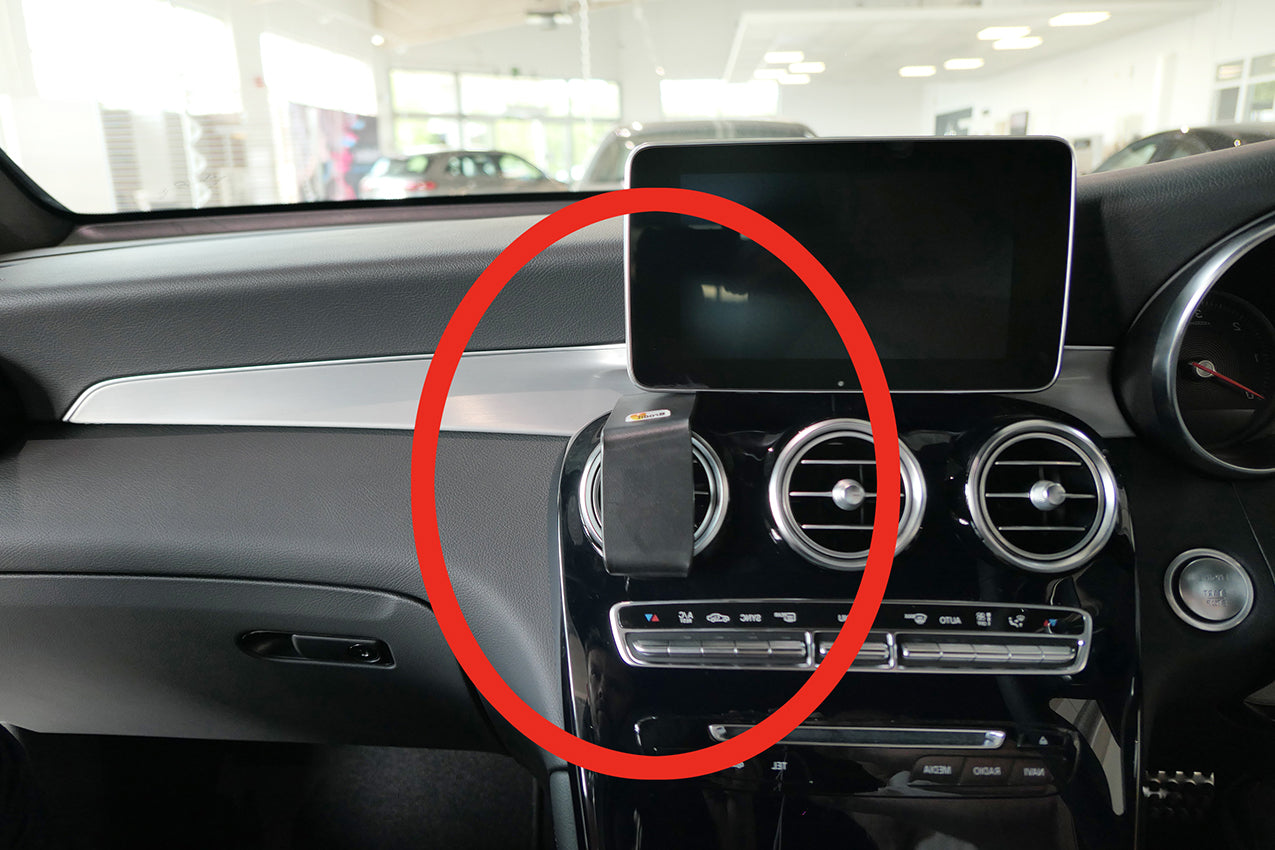 Mielőtt a ProClipet rögzítené, kérjük, tekintse meg a képeket és figyelmesen olvassa el a használati útmutatót! 1. Tisztítsa meg azt a felületet, ahová kerülni fog a ProClip a mellékelt alkoholos párnával. Távolítsa el a ragasztócsík borítását a ProClipről. Helyezze a ProClip felső élét a szellőzőnyílás bal oldalára. Nyomja a felső élének a jobb élét a vezérlő panelt körülvevő keret és a műszerfal közötti résbe. 2. Nyomja/csúsztassa a ProClipet jobbra, hogy a felső éle a vezérlő panelt körülvevő keret mögé akadjon. 3. Nyomja a mellékelt réstágító vékonyabbik végét a szellőzőnyílást körülvevő keret és a vezérlő panel közötti résbe és tartsa a résben. Akassza a ProClip alsó élét a résbe, a réstágító mellé. Húzza ki a réstágítót. 4. A ProClip a helyére került. |
