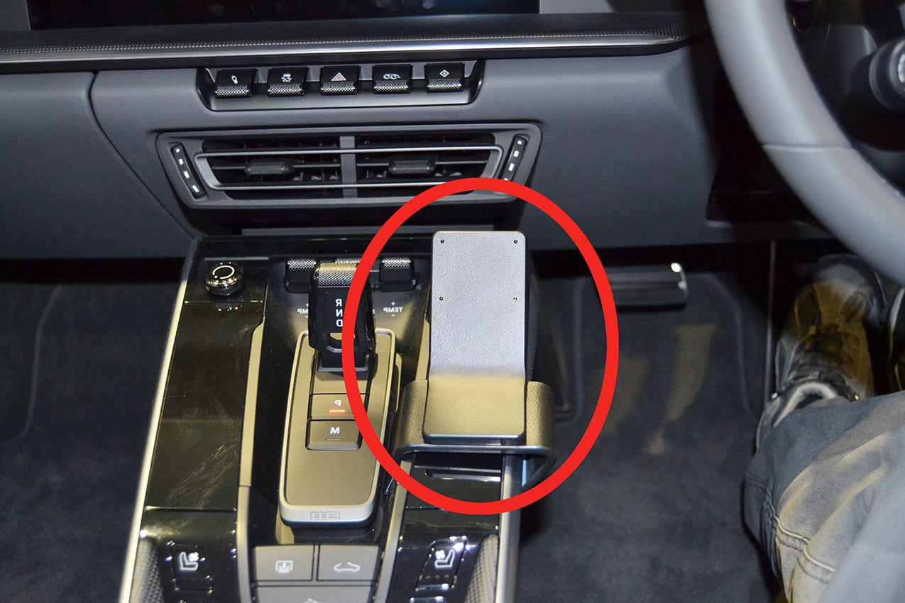2. Press the left edge of the ProClip into the gap between the frame surrounding the gear shift and the inner side panel so the angled edge hooks under the side panel.