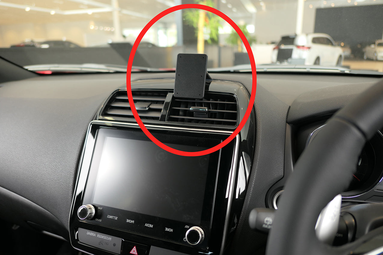 1. Use the enclosed alcohol pad to clean the area where the ProClip is to be installed. Press the thin end of the enclosed "Gap Opener" in the gap between the center console and the dashboard, to widen the gap. Peel off the adhesive tape covers on the ProClip. Hook the angled edge on the lower part of the ProClip under the frame surrounding the air vent.