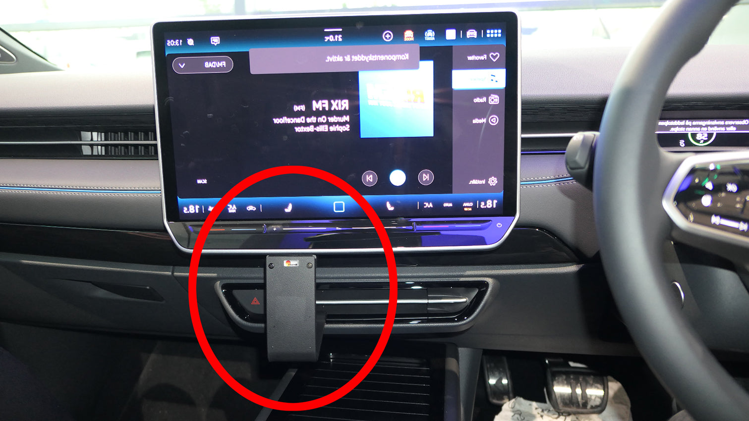 1. A mellékelt alkoholos párnával tisztítsa meg azt a területet, ahová a tartó felszerelésre kerül. 2. Húzza le a rögzítő részen, a tartó kisebbik részén lévő ragasztószalagos borítást. Tartsa a rögzítő részt közvetlenül a vészvillogó gombjától balra. Nyomja a vékony szélét a középkonzol és az alatta lévő tartó díszléc közötti résbe. Nyomja felfelé a rögzítő részt, hogy a ragasztószalag a középkonzol alatt rögzüljön.