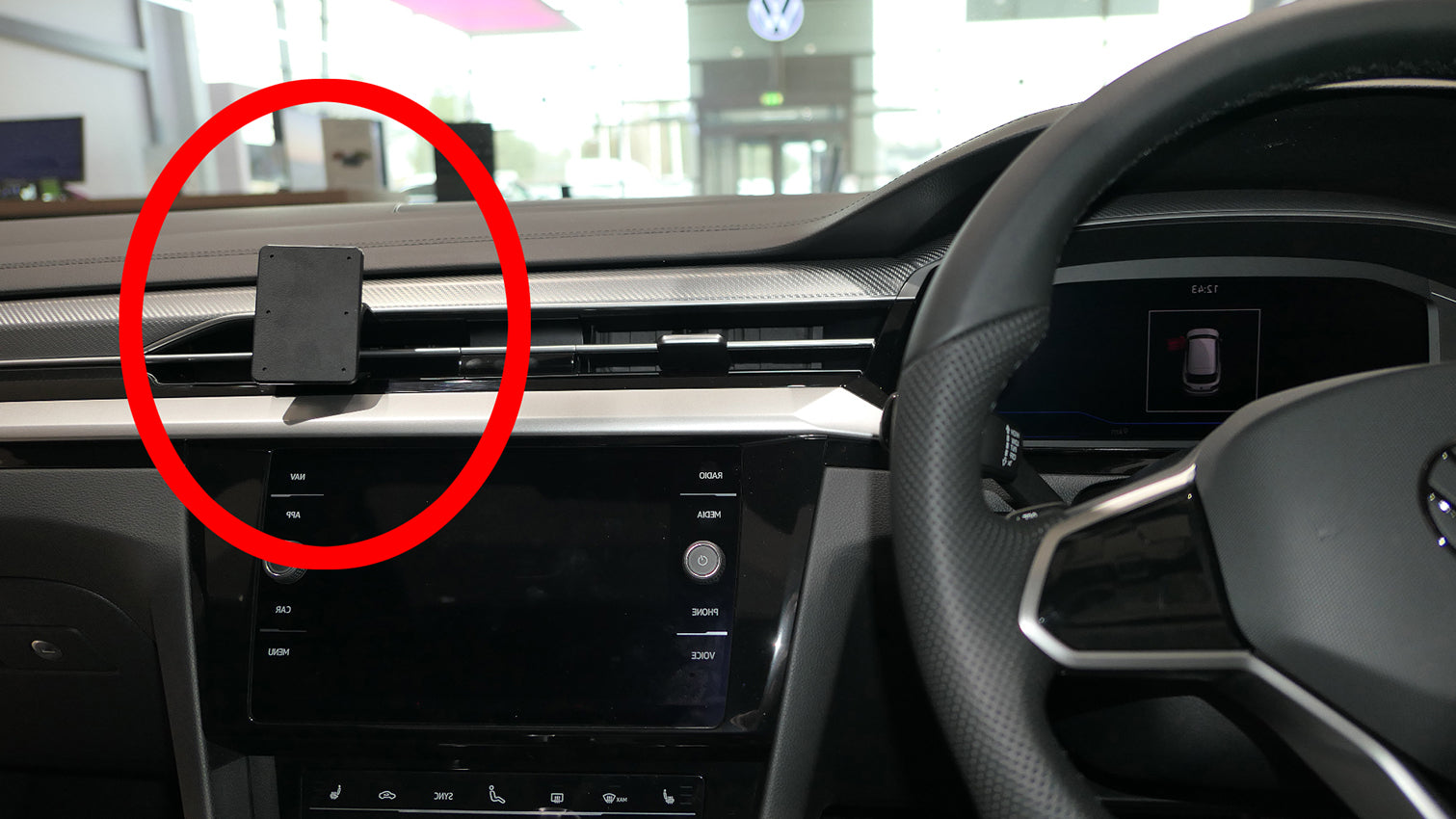 1. A mellékelt alkoholos párnával tisztítsa meg azt a területet, ahová a tartó felszerelésre kerül. Húzza le a ragasztószalagos borítást. Akassza be a tartó ferde felső élét a szellőzőházat körülvevő keret alá.