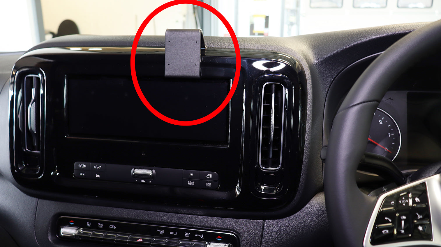 1. A mellékelt alkoholos párnával tisztítsa meg azt a területet, ahová a tartó felszerelésre kerül. Húzza le a ragasztószalagos borítást. Nyomja a tartó alsó szélét a képernyő és a környező keret közötti résbe. 2. Húzza felfelé a tartó felső részét, és akassza be a felső szélét a kezelőpanel és a műszerfal közötti résbe. 3. Nyomja rá a tartóra, hogy az megfelelően a helyére üljön, és a ragasztószalag rögzüljön. 4. A ProClip tartó a helyén van.K1 |