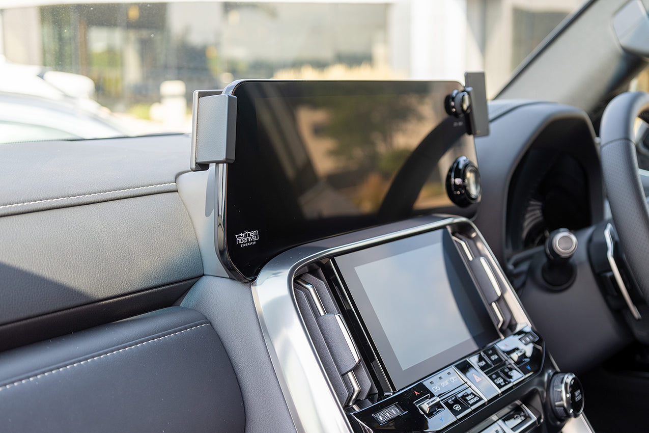 2. Tartsa a tartót a képernyő felett úgy, hogy a rögzítőlemez a vezető oldalán legyen. Lassan és határozottan nyomja le a tartó mindkét oldalát, hogy a képernyőre csúsztassa/akasztja.