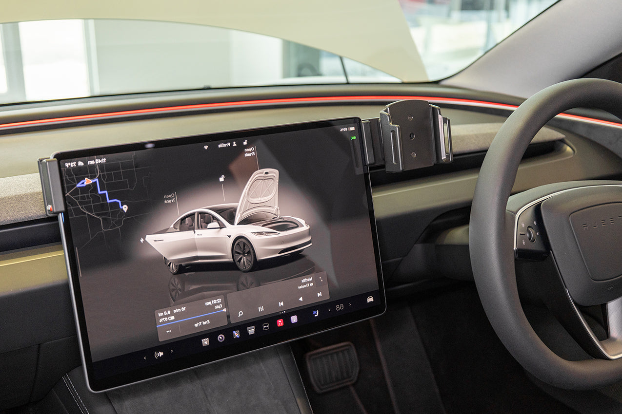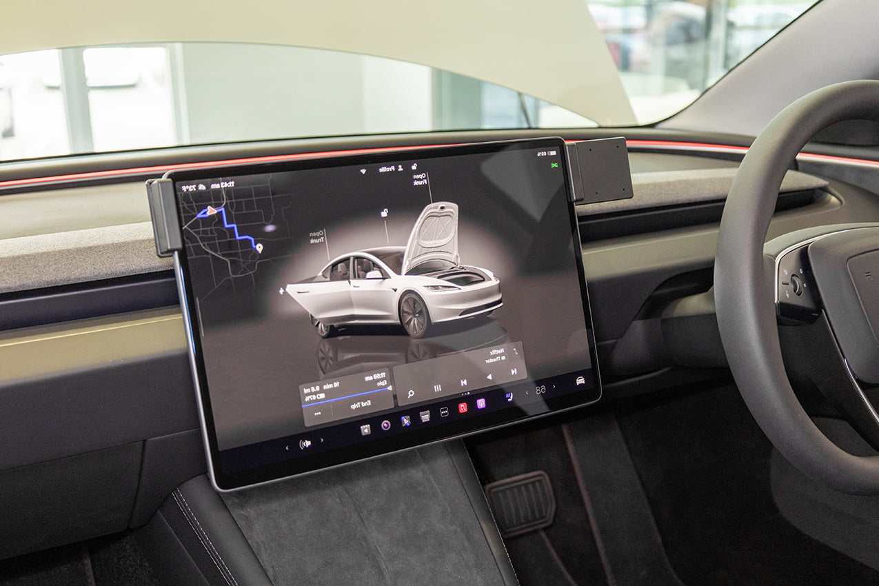 3. Hold the mount over the screen so the mounting plate is on the driver's side. Slowly and firmly, press down on both sides of the mount to slide/hook it onto the screen. Gently flex the sides out to ease the installation. Press downward until the mount is securely in place.