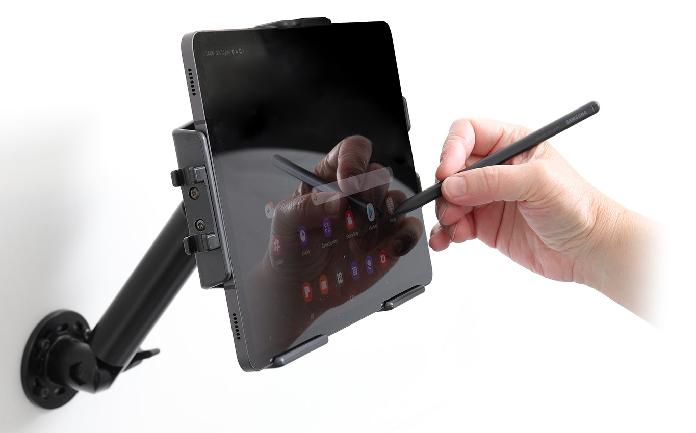 A tartó csuklóval rendelkezik, így könnyedén beállíthatja a szöget a jobb megtekintés érdekében, vagy válthat a portré és a tájoló üzemmód között. 17°-ban dönthető és 360°-ban forgatható. Szerelőlemez 42x50 mm-es, 4 mm-es AMPS-lyukakkal. Kiváló minőségű fekete ABS/Acetál műanyagból készült. Svédországban készült.