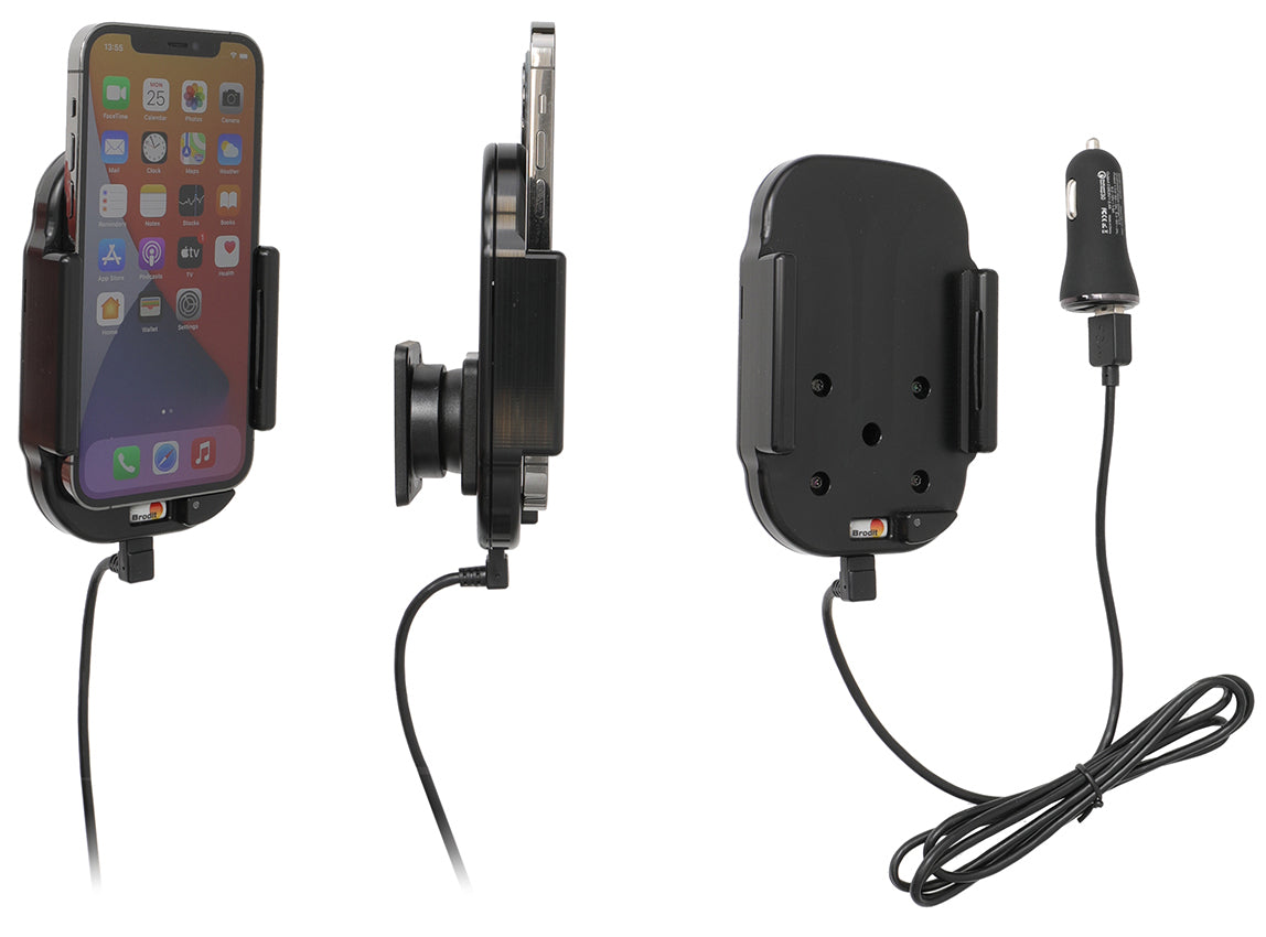 USB-A kábellel és szivargyújtó adapterrel rendelkezik, hogy csatlakoztassa a jármű 12/24 Volt-os aljzatához. A szivargyújtó adapter 2 USB-A bemenettel rendelkezik: QC 3.0A + 2.4A. Az eszköz töltőkábelét mindig a tápegység zöld USB-A portjához kell csatlakoztatni (1. kimenet), hogy a tartó gyorstöltés módban működjön. A fehér USB-A töltő port (2. kimenet) a tartalék és egy másodlagos eszköz (mobiltelefonok/navigációs készülékek) töltésére alkalmas. Ez egy 15 W-os gyorstöltő tartó. A gyorstöltés eszközfüggő.