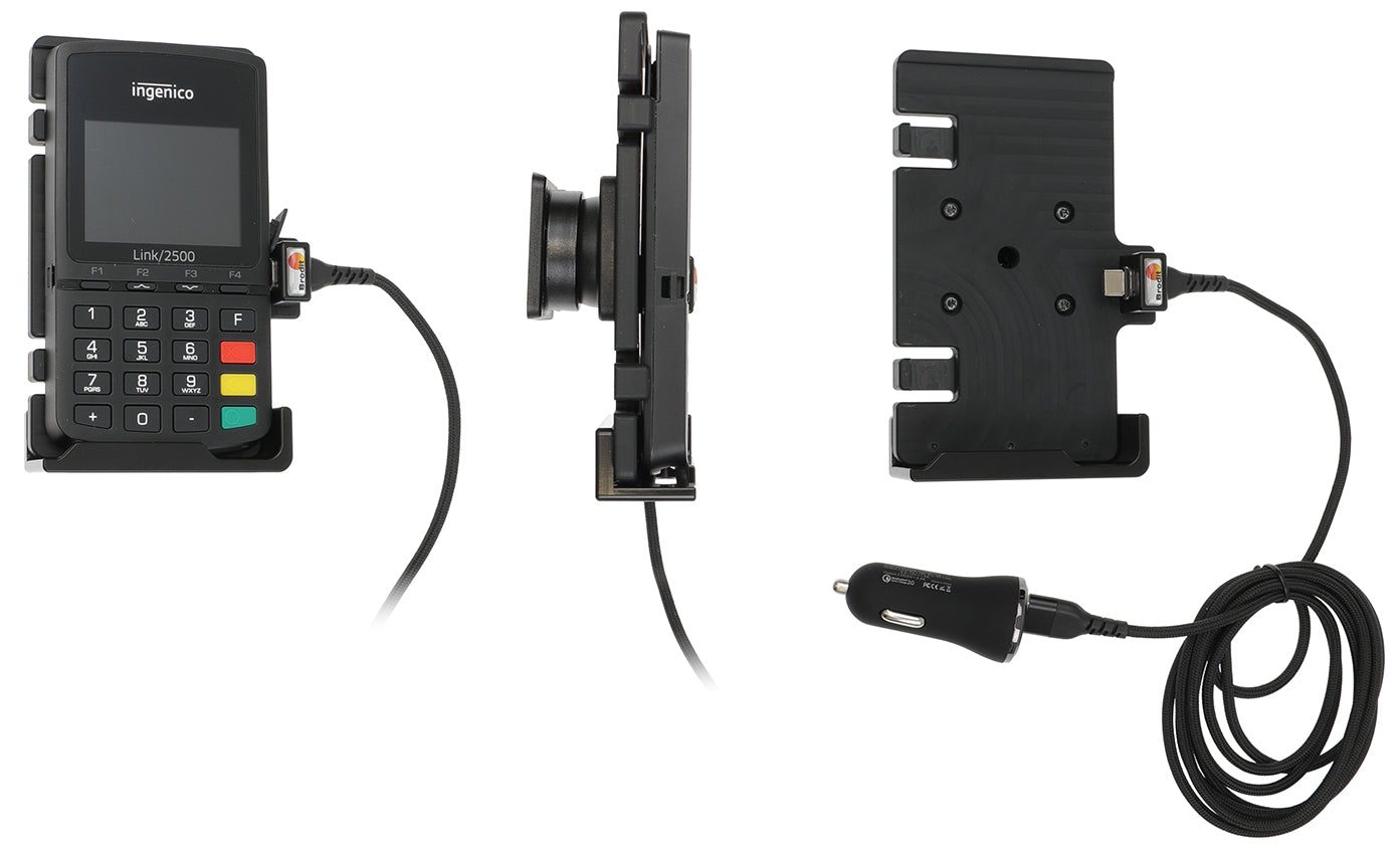 Mágneses fejjel. USB-kábellel + szivargyújtóval, 2 USB port: QC 3.0A + 2.4A. Csuklóval. 12/24 V. Ingenico Link/2500 SLIM & INTEGRATION verzió, oldalán Type-C töltéssel.