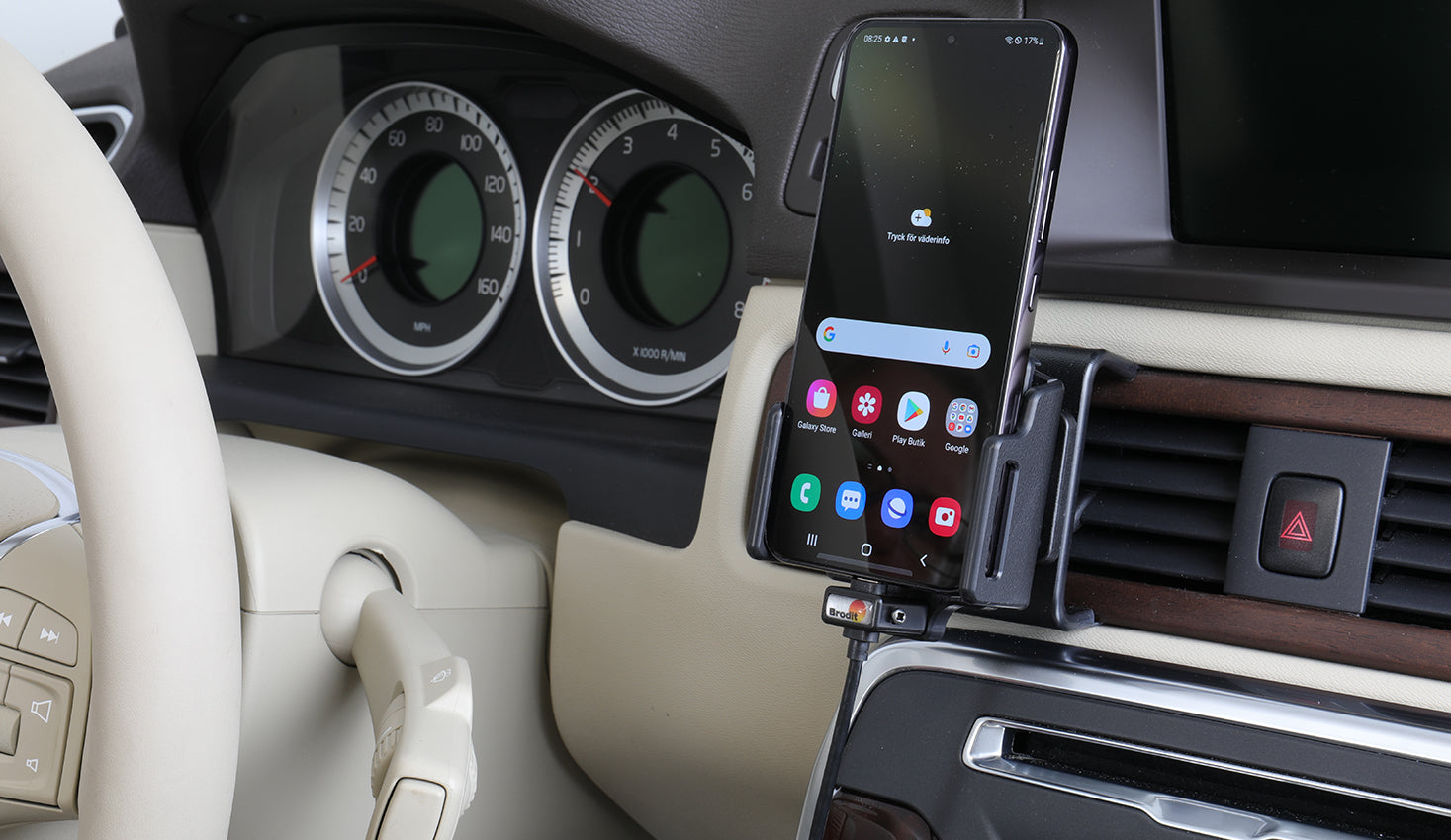 Állítható tartó Type-C csatlakozóval. 62–77 mm széles, 6–10 mm vastag, tokkal rendelkező készülékhez. USB-kábellel és szivargyújtóval. 2 USB-port: QC 3.0A + 2.4A. Csuklóval. 12/24V.
