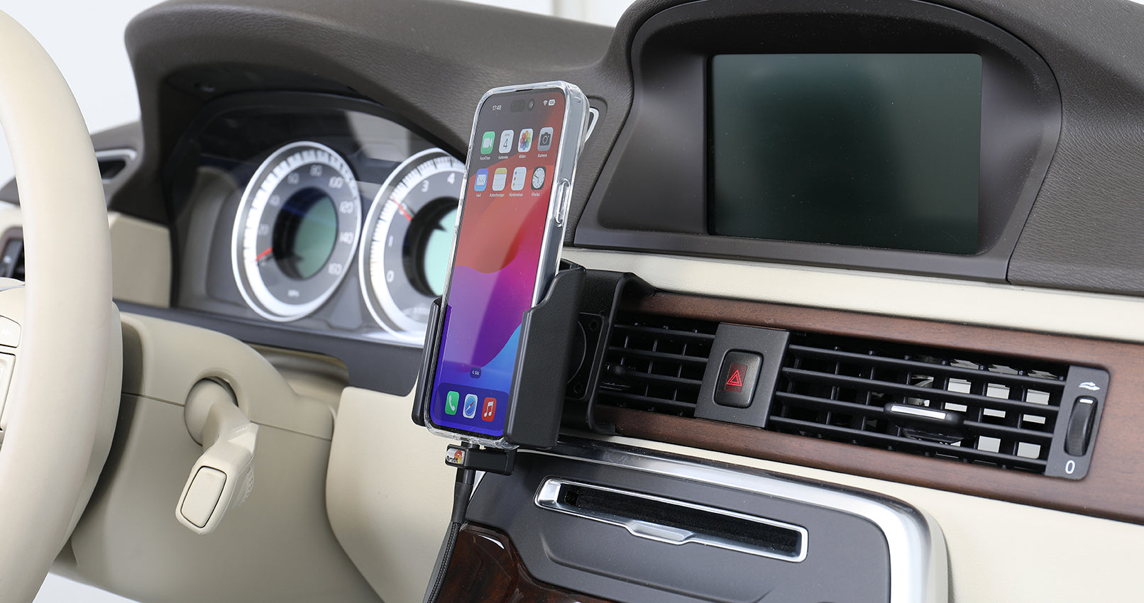 USB Type-C + autós töltővel, 2 USB-port: Type-A és Type-C. Csuklóval. 12/24 Volt. Brodit telefontokkal.