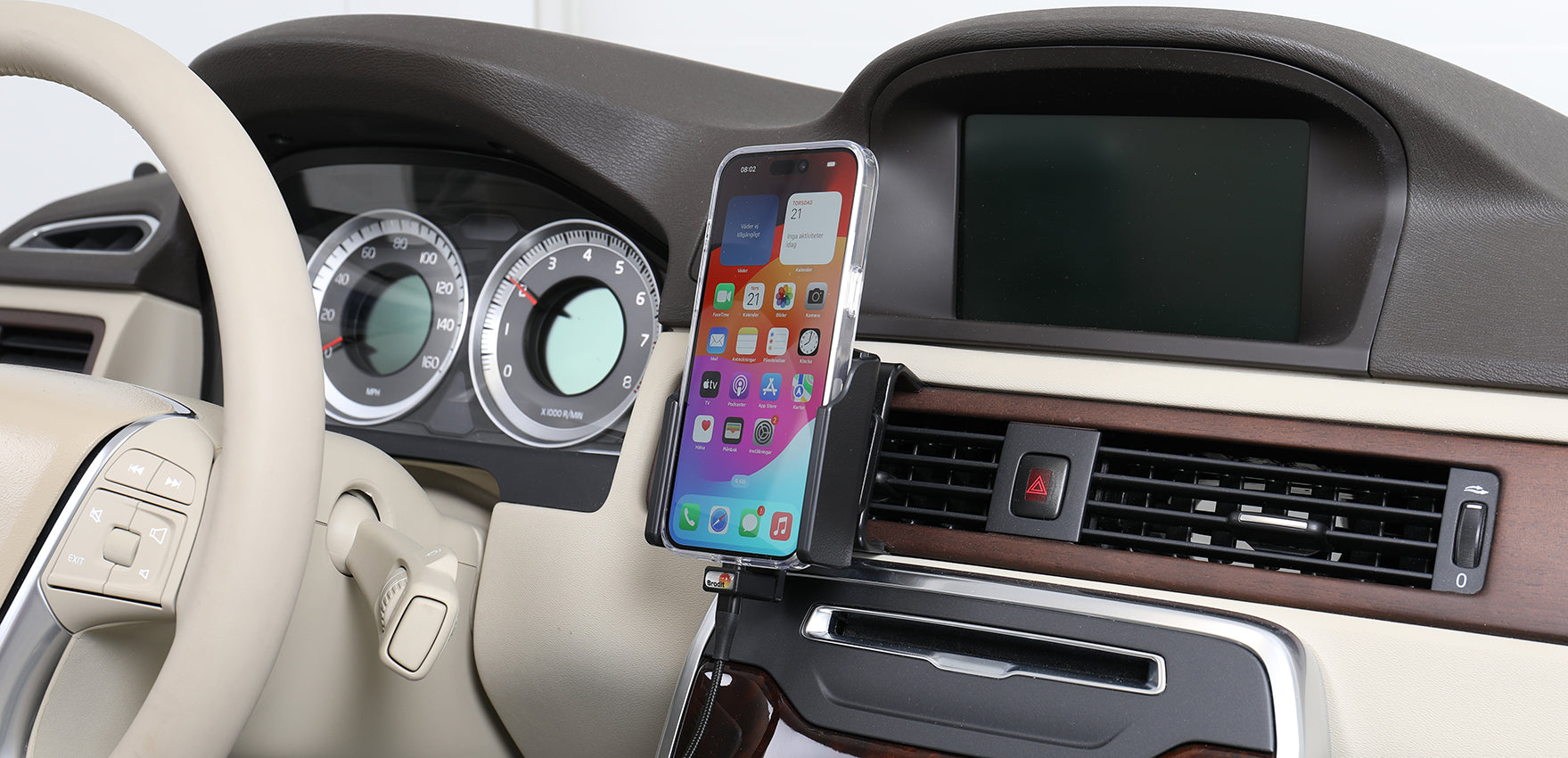 USB Type-C + autós töltővel, 2 USB-port: Type-A és Type-C. Csuklóval. 12/24 Volt. Brodit telefontokkal.