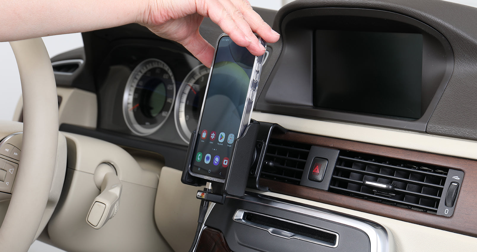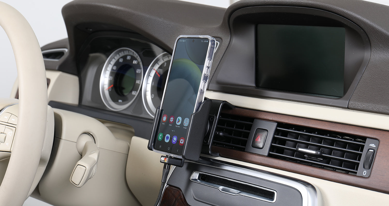 USB Type-C + autós töltővel, 2 USB-port: Type-A és Type-C. Csuklóval. 12/24 Volt. Brodit telefontokkal.