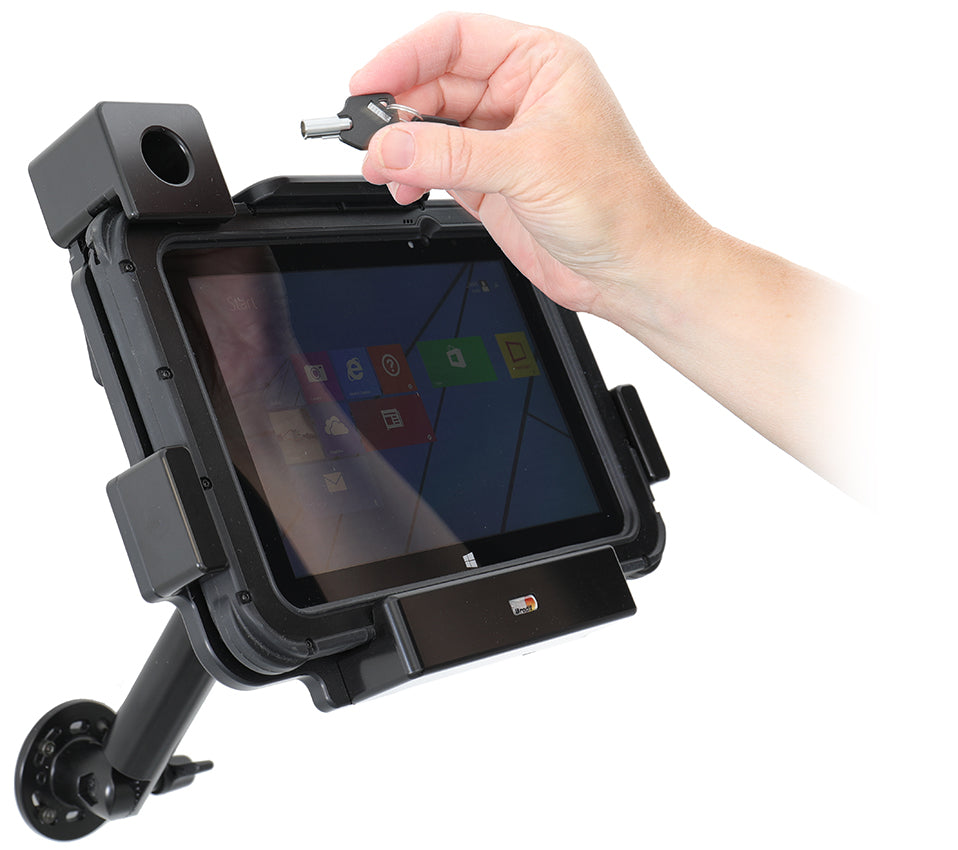 Ez a bölcső tökéletes választás, ha azt szeretné, hogy a készülék biztonságosan rögzítve legyen a helyén, ugyanakkor könnyen hozzáférhető legyen. Lehetővé teszi a bővített akkumulátorok cseréjét. A kulcsos zár megakadályozza, hogy a táblagépet illetéktelenek eltávolítsák, a készülék eltávolításához kulcsra van szükség (2 kulcsot tartalmaz).