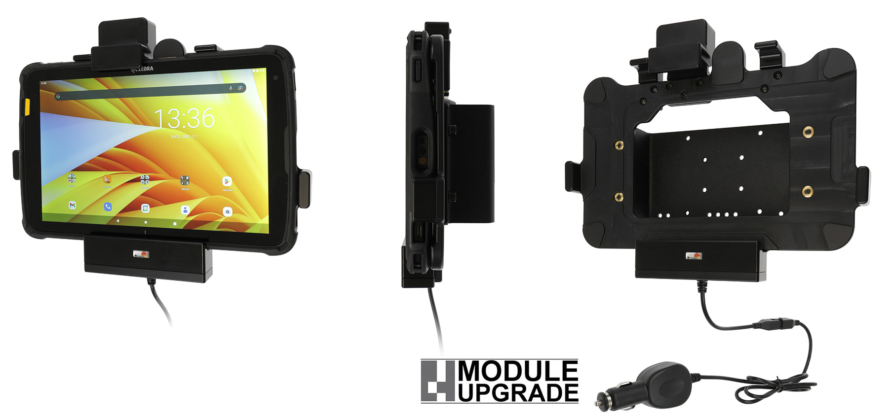 Aktív tartó szivargyújtóval. Rugged Boot / Exoskeleton tokos készülékhez, Zebra bővítőháttal. AMPS és VESA 75 furatokkal. Modulbővítésre alkalmas. Easy-switch rendszerrel.
