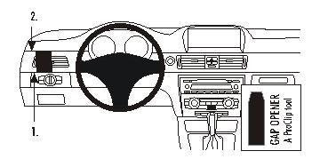Figyelem! Összeszerelés előtt kérjük, figyelmesen olvassa el a használati utasítást és nézze meg az ábrákat, mielőtt rögzíti a ProClip-et! 1. Nyomja a mellékelt réstágítót a műszerfa és a légrács panel ezüst kerete közötti résbe, hogy kitágítsa a rést. Távolítsa el az öntapadó felület borítását a ProClipen. 2. Csúsztassa a ProClip alsó, hornyos részét a résbe, közvetlenül a réstágító mellett. Csúsztassa a réstágítót tovább a kormány irányába a lámpakapcsoló panel fölé, hogy a rést még tágabbra feszítse. Csúsztassa a ProClipet a résbe a réstágítóig. Húzza ki a réstágítót. 3. Határozottan nyomja előre a ProClip felső részét, hogy a hajlított él belemenjen az ezüst keret és a műszerfal kárpitozott része közötti résbe. Nyomja amíg nem érzi, hogy a helyére került. 4. A ProClip a helyére került. |