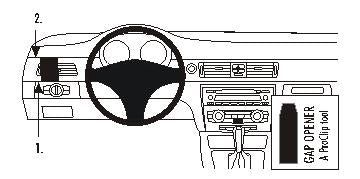 Figyelem! Összeszerelés előtt kérjük, figyelmesen olvassa el a használati utasítást és nézze meg az ábrákat, mielőtt rögzíti a ProClip-et! 1. Nyomja a mellékelt réstágítót a légrács körüli keret és a műszerfal közötti résbe, hogy kitágítsa a rést. Távolítsa el az öntapadó felület borítását a ProClip. 2. Nyomja a ProClip alsó, hornyos részét a résbe, közvetlenül a réstágító mellett. Nyomja amíg nem érzi, hogy a helyére ugrott. Húzza ki a réstágítót. 3. Helyezze a réstágítót a műszerfal és a légrács körüli keret közötti résbe. Nyomja előre a ProClipet, hogy a felső hajlított él beakadjon a résbe, közvetlenül a réstágító mellett. Húzza ki a réstágítót. 4. A ProClip a helyére került. |