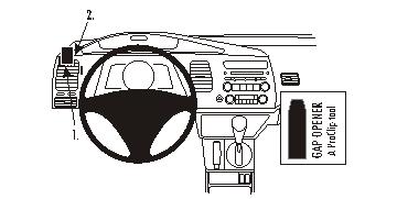 Figyelem! Összeszerelés előtt kérjük, figyelmesen olvassa el a használati utasítást és nézze meg az ábrákat, mielőtt rögzíti a ProClip-et! 1. Nyomja a mellékelt réstágítót a műszerfal és a légrács körüli keret közé, hogy kitágítsa a rést. Távolítsa el az öntapadó felület borítását a ProClipen. 2. Akassza a ProClip alsó, hajlított részét, a képen látható módon, a légrács fix része alá. 3. Nyomja előre a ProClipet hogy a hajlított felső él beakadjon a résbe, közvetlenül a réstágító mellett. Húzza ki a réstágítót. 4. A ProClip a helyére került. |