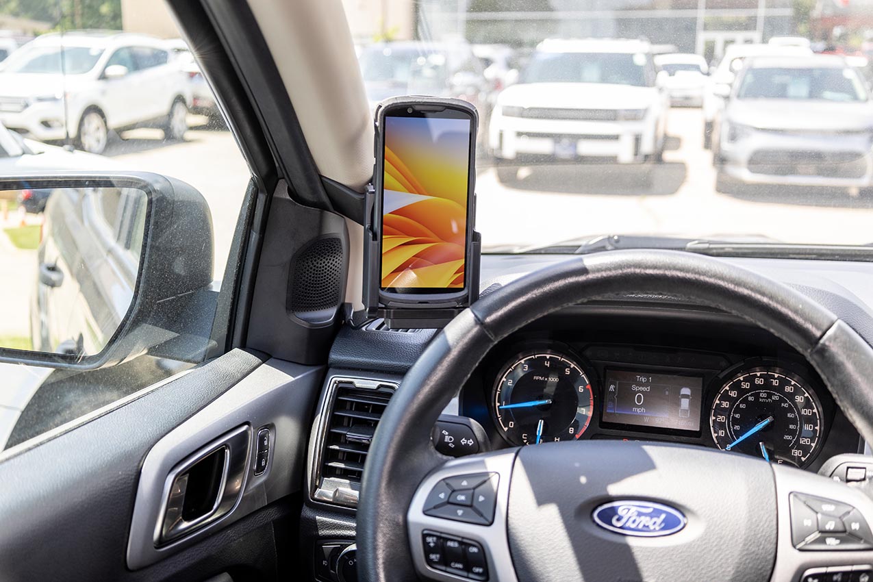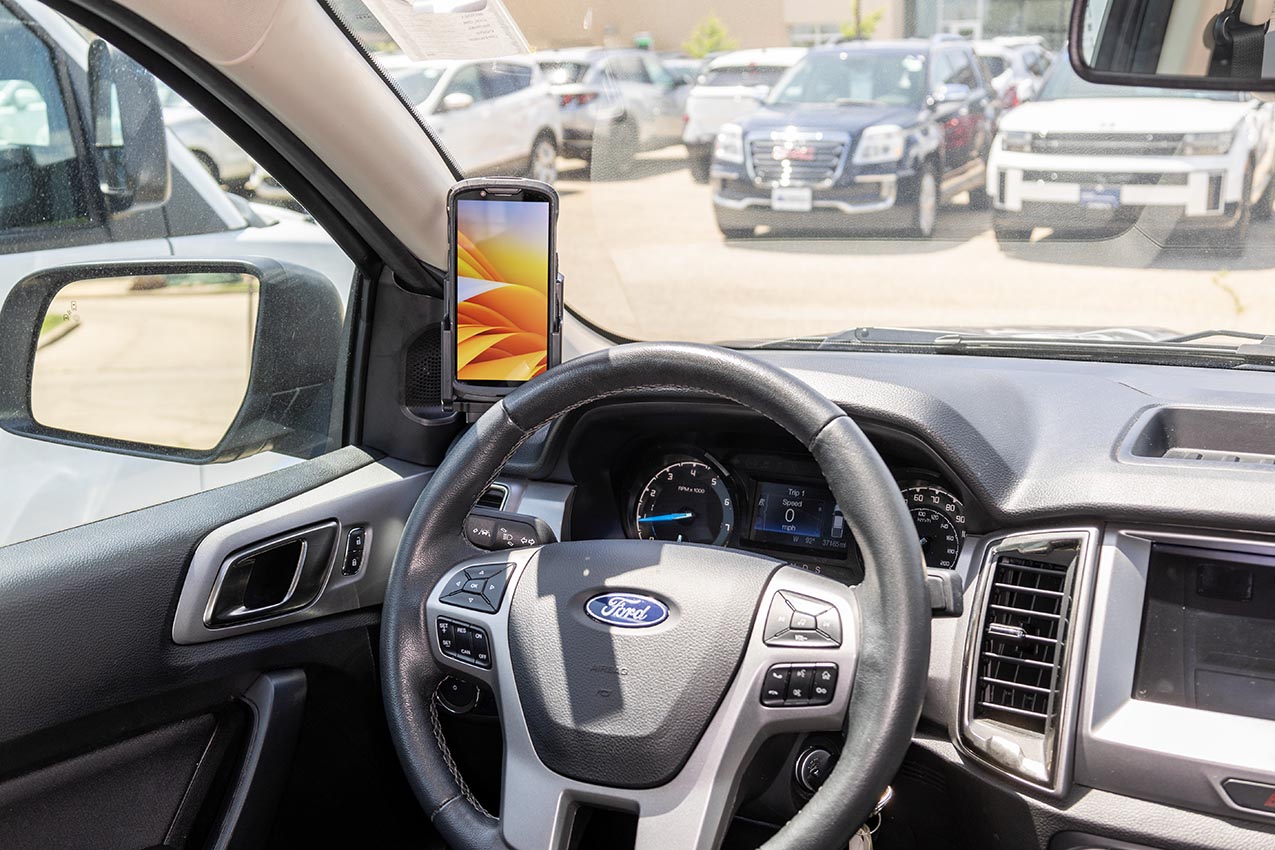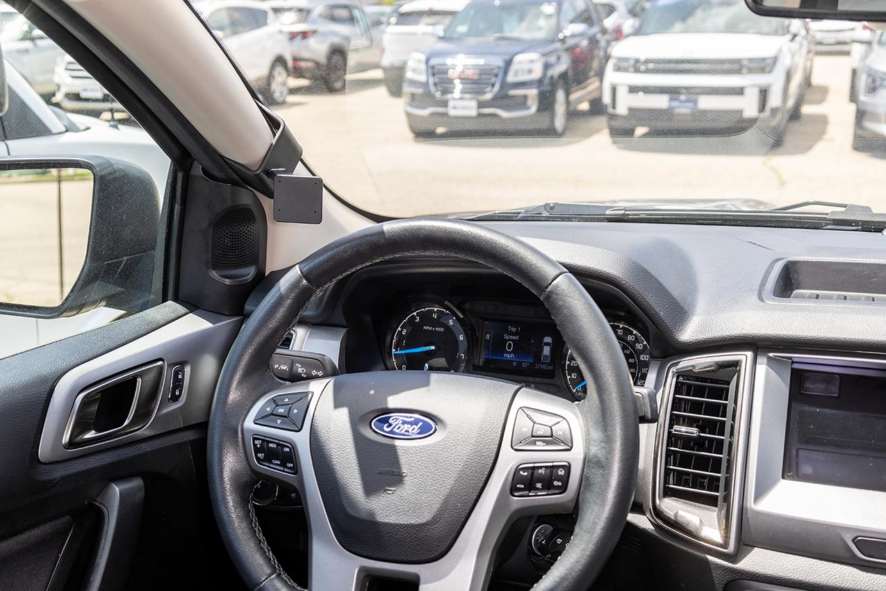 2. Press the left edge of the mount into the gap and hook it behind the A-post.