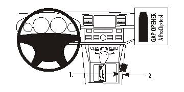 Kérjük, figyelmesen olvassa el a használati utasítást és nézze meg az ábrákat, mielőtt rögzíti a ProClip-et! 1. A mellékelt réstágító keskeny végét nyomja a központi konzol paneljének pereme és a konzol pereme közötti résbe, hogy kitágítsa azt! Távolítsa el a ProClip ragasztócsíkjának borítását! 2. Nyomja a ProClip bal oldali részének szögletes szegélyét a réstágító mellett a résbe! 3. Nyomja a ProClip jobb oldali részét erősen lefelé úgy, hogy annak szögletes szegélye beakadjon a konzol pereme mögé a kárpitnál! Addig nyomja, amíg meg nem látja vagy hallja/érzi, hogy bekattant a helyére! Húzza ki a réstágítót! 4. A ProClip a helyére került. |