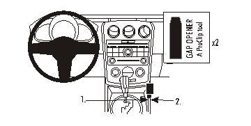 Kérjük, figyelmesen olvassa el a használati utasítást és nézze meg az ábrákat, mielőtt rögzíti a ProClip-et! 1. A mellékelt réstágítók keskeny végét nyomja a központi konzol oldalfala és a konzol pereme közötti résbe, hogy kitágítsa azt! Távolítsa el a ProClip ragasztócsíkjának borítását! 2. Helyezze a ProClip-et a konzol pereme fölé! 3. Nyomja a ProClip jobb oldali részét erősen lefelé úgy, hogy annak szögletes szegélye a réstágítók között a résbe kerüljön! Addig nyomja, amíg meg nem látja vagy hallja/érzi, hogy bekattant a helyére! Húzza ki a réstágítókat! 4. A ProClip a helyére került. |