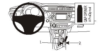 Mielőtt elkezdené a telepítést, kérjük, tekintse meg a képeket és figyelmesen olvassa el a használati útmutatót! 1. Helyezze a mellékelt réstágító vastagabb felét a képen látható helyre, így meghatározhatja, hová fog kerülni a ProClip. 2. A mellékelt alkoholos kendő segítségével tisztítsa meg azt a területet, ahová a ProClip kerülni fog. Távolítsa el az öntapadó matricát a ProClipről. Nyomja/akassza a ProClip bal oldalán található meghajlított élt a váltókar kerete és a felső padló konzol széle közti résbe, a réstágító elé. 3. Nyomja a réstágító vékonyabbik felét a konzol oldalfalán található résbe, a ProClip mellé. Nyomja le a ProClip jobb oldalának felső részét, így az lefelé fog hajlani. Az alsó meghajlított élnek be kell akadnia a résbe, a réstágító mellé. Húzza ki a réstágítót. 4. A ProClip a helyére került. |