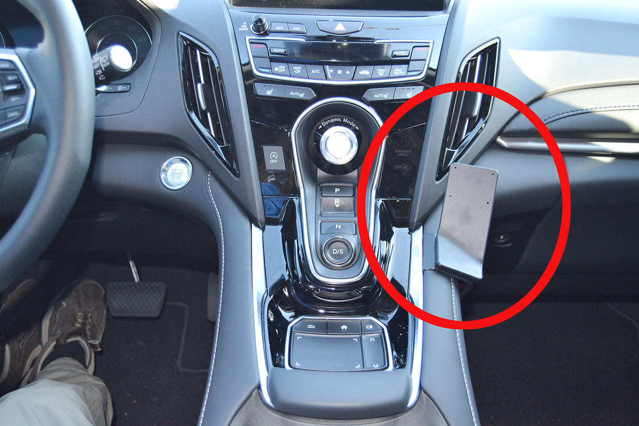 2. Press downward on the right side of the ProClip. At the same time, press the lower edge of the ProClip toward the floor console. Hook the right lower edge of the ProClip under the padded floor console sidewall.