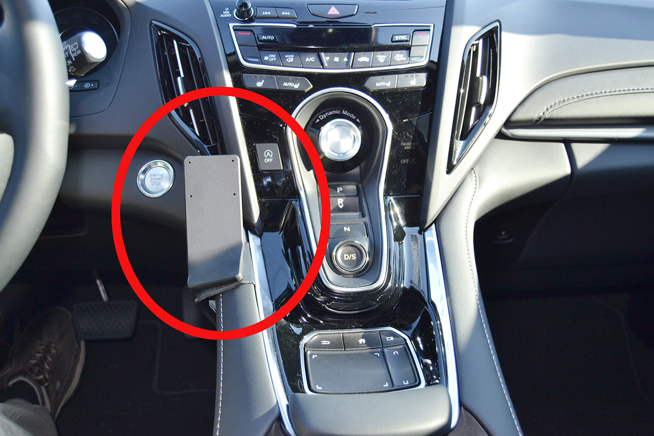 2. Press downward on the left side of the ProClip. At the same time, press the lower edge of the ProClip toward the floor console. Hook the left lower edge of the ProClip under the padded floor console sidewall.
