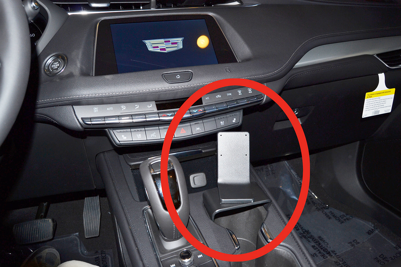 2. Press the ProClip to the left and insert the thin right edge of the ProClip into the seam between the cup holder and the top frame around the cup holder.