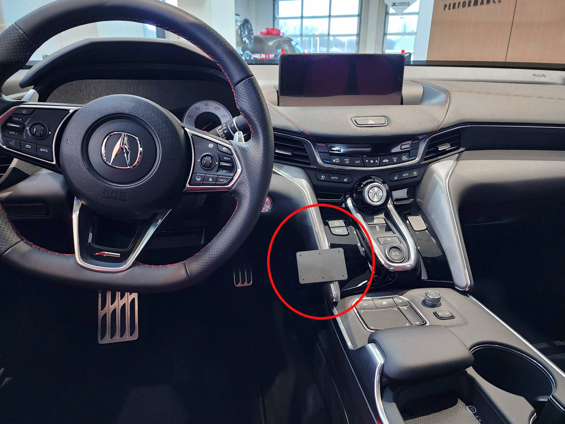 1. Óvatosan tisztítsa meg azt a területet, ahol a tartó rögzülni fog. Távolítsa el a ragasztószalagos borítást. A rögzítés helyét a középső váltógomboktól balra, a start gomb közelében kell meghatározni. Óvatosan nyomja be az alsó peremet a fenti képen látható résbe. Érezni fogja, hogy minimális erőfeszítéssel belecsúszik a résbe.