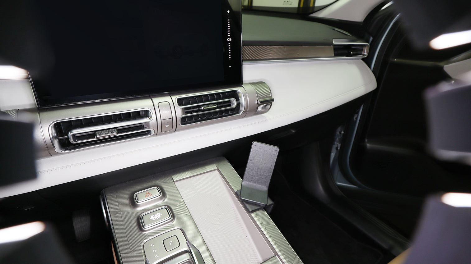 1. Óvatosan helyezze a tartót a középkonzol keretére, anélkül, hogy hozzáérne a párnázott felülethez. Akassza be a tartó alsó szélét a középkonzol keretének oldalfala alá.