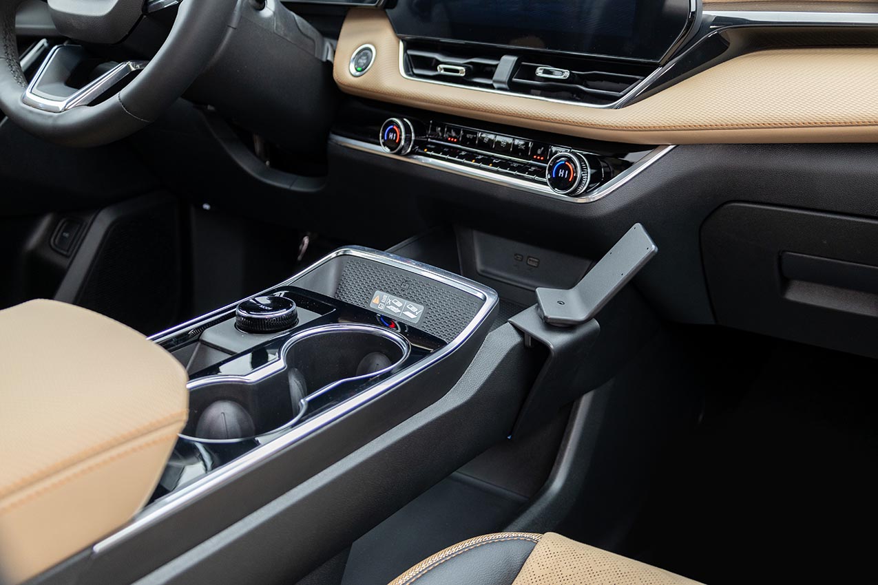1. Használja a mellékelt alkoholos kendőt a terület megtisztítására, ahová a tartót felszereli. Távolítsa el a ragasztószalag fedőrétegét. Akassza be a tartó felső élét a rekesz falának és a konzol burkolatának közötti résbe.