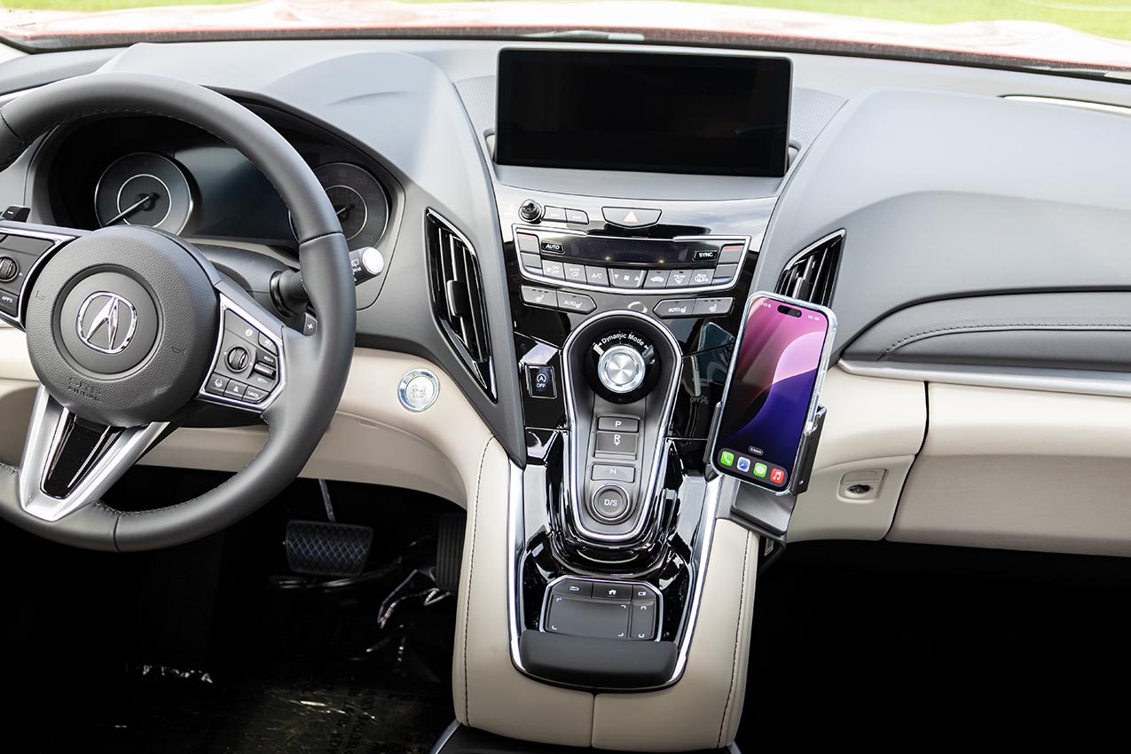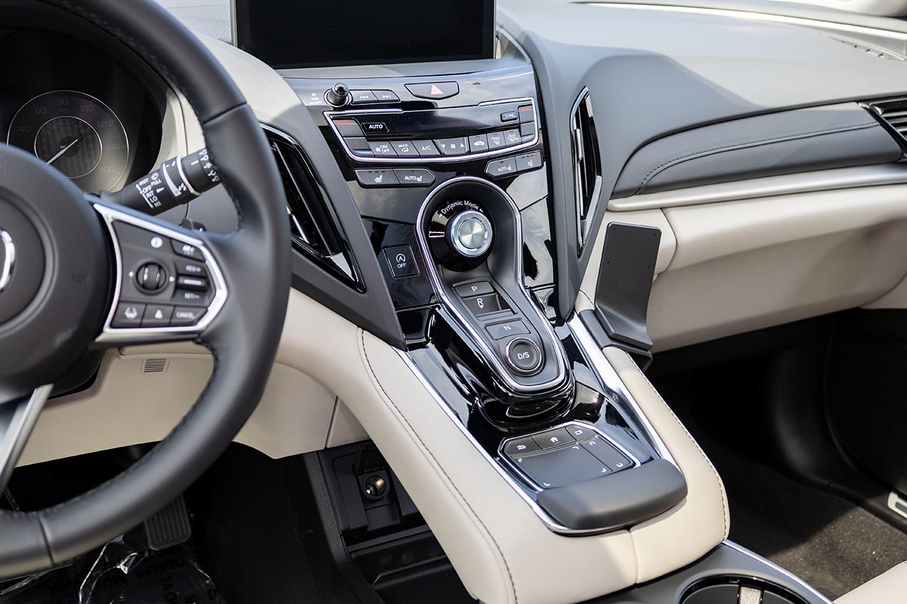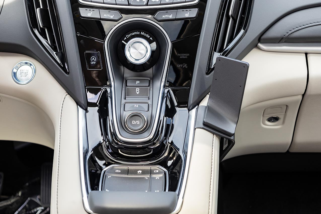 1. Position the mount forward along the right side of the console. Press the upper edge into the gap between the console side and the accent trim.