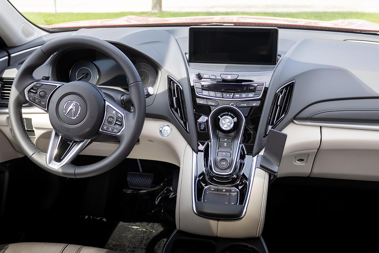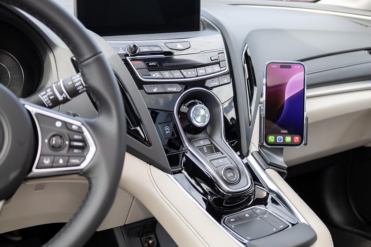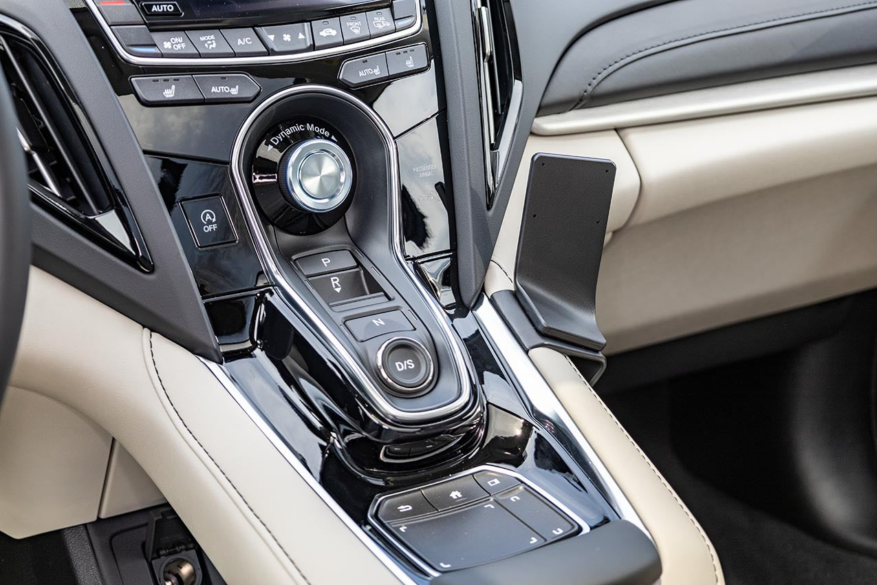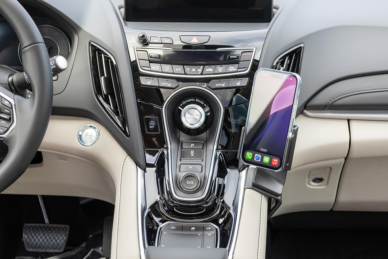 1. Position the mount forward along the right side of the console. Press the upper edge into the gap between the console side and the accent trim.