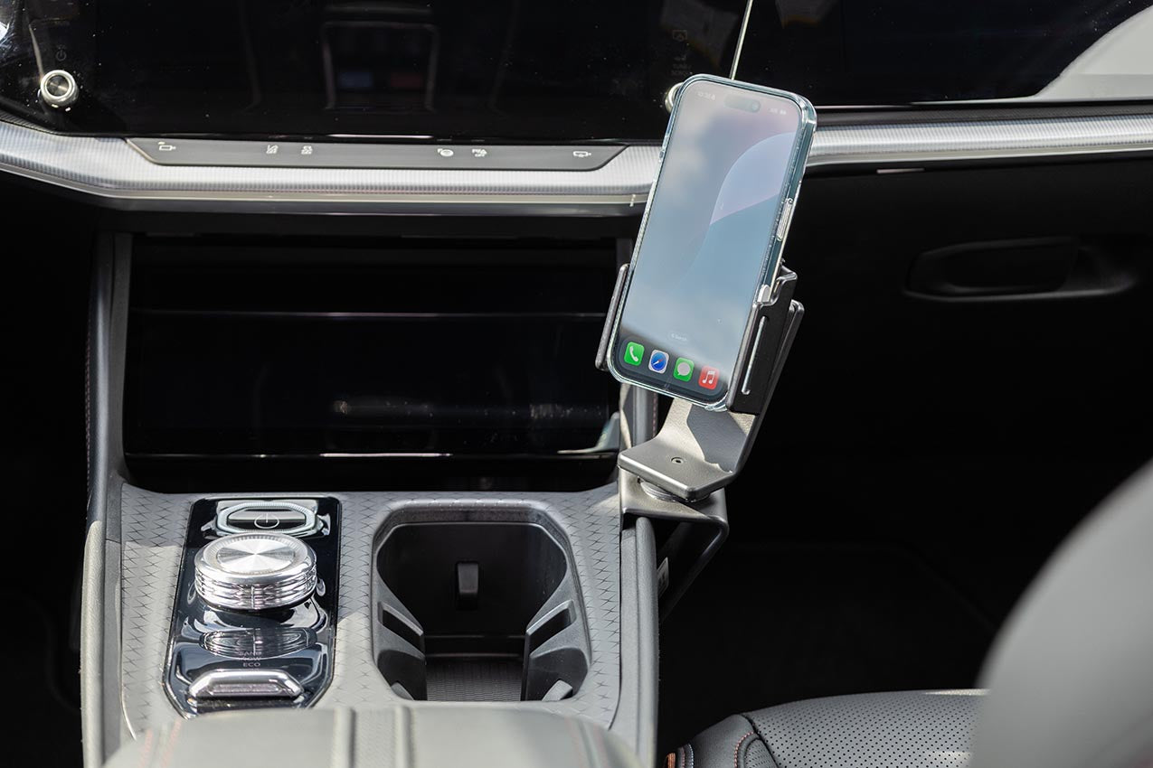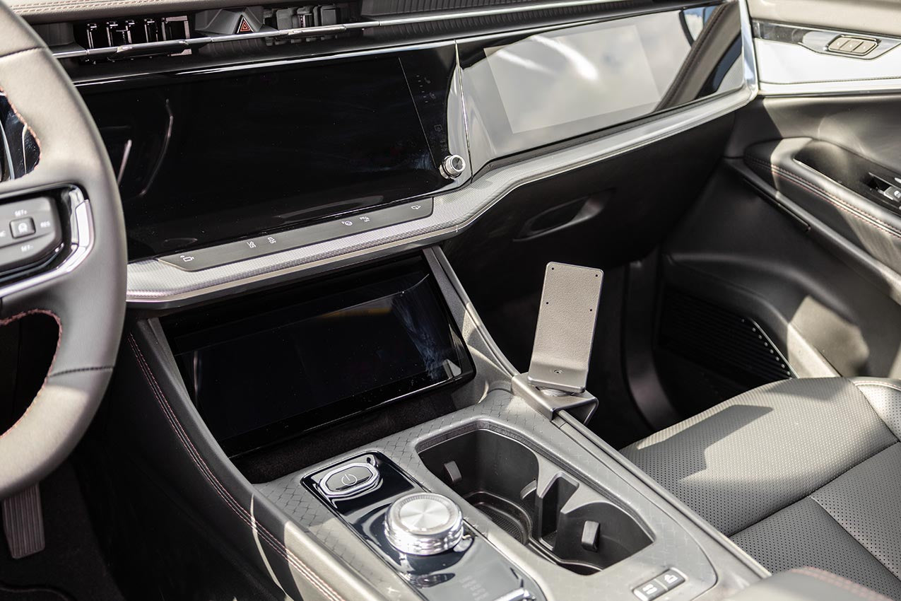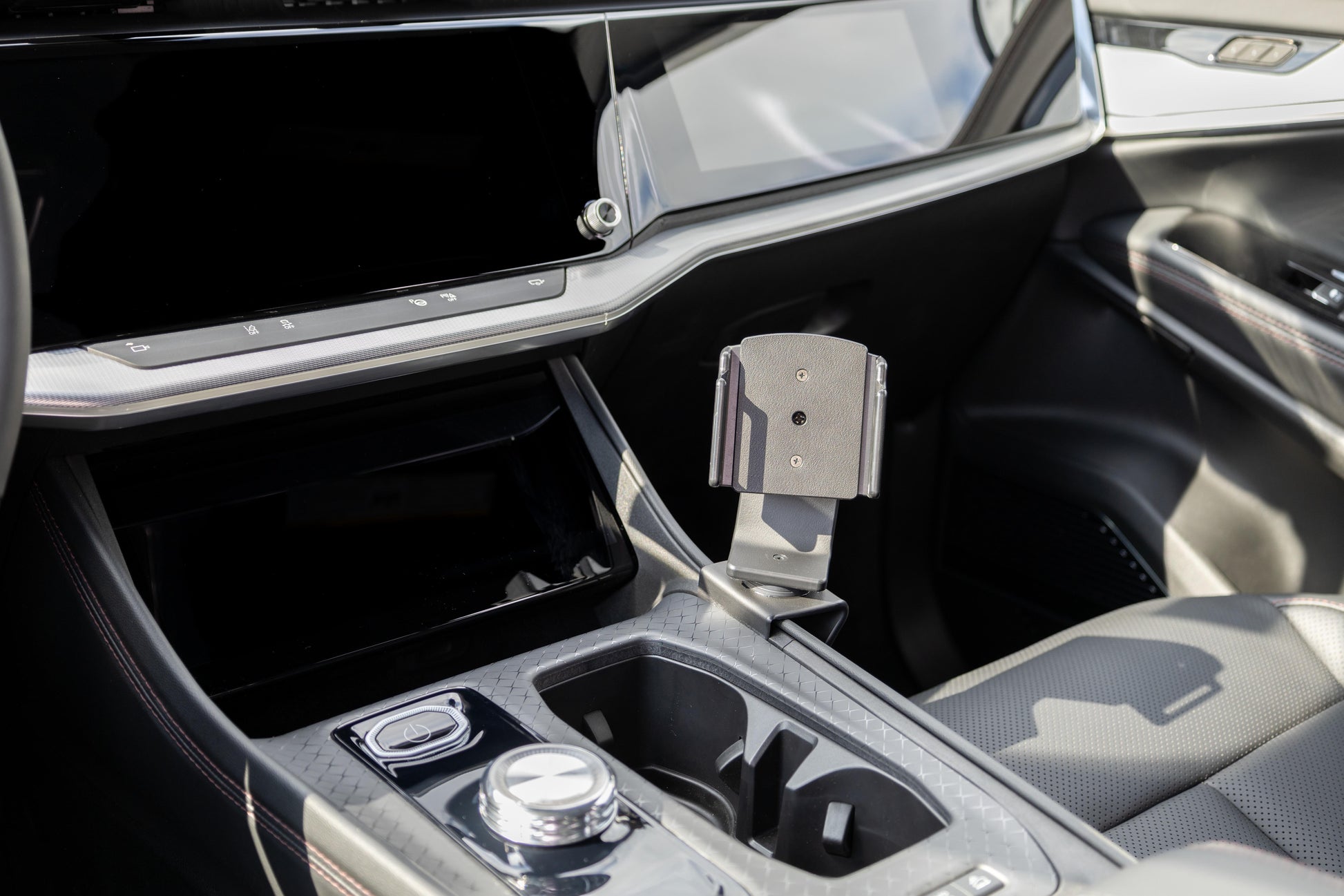 1. Use the enclosed alcohol pad to clean the area where the mount will be installed. Peel off the adhesive tape cover. Position the mount in-line with the front of the cup holders. Press the upper edge into the seam between the console top and console wall. Press down on the top of the mount until the lower edge clips under the top section of the console wall.