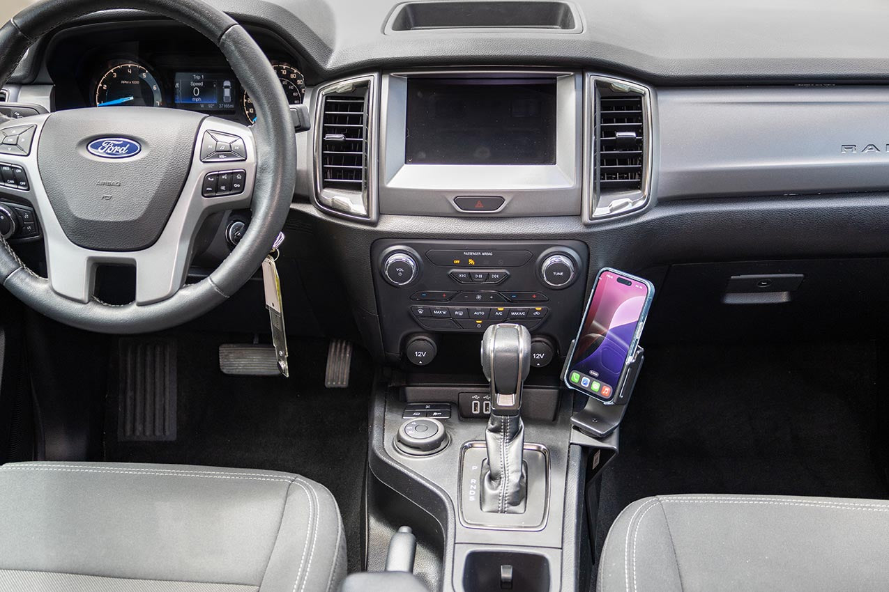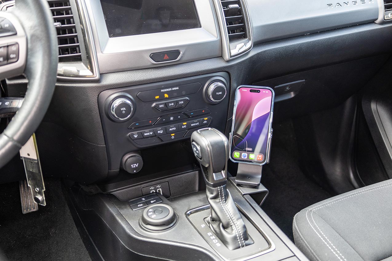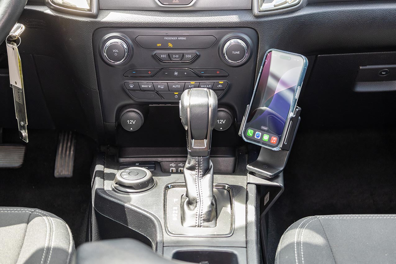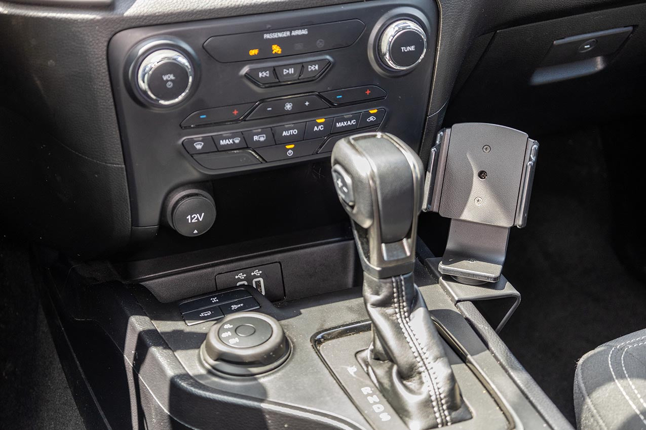 2. Press down on the top of the mount and in on the bottom of the mount until the lower edge snaps/clips under the console sidewall.