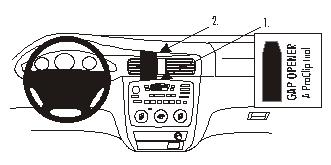 Figyelem! Ez a ProClip illeszthető a Ford Taurus és Mercury Sable 2000- minden műszerfal-változatához. Ha az ön rádió-berendezésének LCD kijelzője kissé eltérő kinézetű, mint a képen látható, ne aggódjék: ez NEM befolyásolja a ProClip rögzítését. Csak kövesse az alábbi utasításokat! 1. A mellékelt réstágító segítségével tágítsa ki a rést a rádió-berendezés és az azt körülvevő panel-keret között! 2. Nyomja a ProClip alsó részének szögletes peremét a réstágító melletti résbe, és ugyanakkor húzza a ProClip-et fölfelé és előre a ventilátor irányában úgy, hogy a ProClip alsó részének szögletes perem beakadjon a rádió-berendezés panelje mögé! Húzza ki a réstágítót! 3. Nyomja előre a ProClip felső részét úgy, hogy a barázdált pereme bepattanjon a résbe a párnázott műszerfal és a légbefúvó-panel kerete között! Addig nyomja, amíg érzékelhetően a helyére nem pattan! 4. A ProClip a helyére került. |