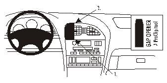 Figyelem! Ha az ön járművében a légbefúvó alatt a panel-keretbe integrált gombsora van, az alábbi útmutató akkor is érvényes. 1. A mellékelt réstágító segítségével tágítsa ki a rést a légbefúvó-panel kerete és a rádió-berendezés között! Nyomja a ProClip alsó részének íves peremét a réstágító melletti résbe! Húzza ki a réstágítót! 2. Csúsztassa a ProClip-et balra! 3. Nyomja előre a ProClip felső részét, és ugyanakkor nyomja lefelé a tetejét úgy, hogy a szögletes pereme bepattanjon a légbefúvó-panel kerete és a párnázott műszerfal közti helyre! 4. A ProClip a helyére került. |
