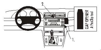Kérjük, olvassa el az összes utasítást és tanulmányozza a képeket, mielőtt a tartót rögzítené! 1. A mellékelt réstágító keskeny végének segítségével tágítsa ki a rést a párnázott műszerfal és a klíma-szabályzó panel között! Távolítsa el a ragasztócsík borítását a ProClip-ről! 2. Nyomja a ProClip függőleges peremét a réstágító fölötti résbe! (Kezdje a rögzítő alsó sarkának illesztésével!). Húzza ki a réstágítót! 3. Nyomja erősen előre a ProClip felső bal oldalát úgy, hogy a szögletes perem a résbe kerüljön a rádió-berendezést körülvevő panel-keret és a légbefúvó között! Addig nyomja, amíg érzékelhetően bepattan a szögletes pereme a panel-keret szegélye fölé! Nyomja előre a ProClip jobb felső részét, hogy megbizonyosodjék arról, hogy a szögletes perem megfelelően bepattant a panel-keret szegélye fölé! 4. A ProClip a helyére került. |