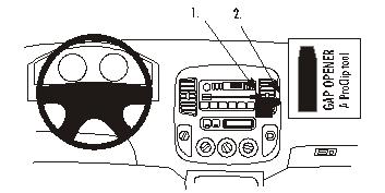 Kérjük, olvassa el az összes utasítást és tanulmányozza a képeket, mielőtt a tartót rögzítené! 1. A mellékelt réstágító keskeny végének segítségével tágítsa ki a rést a rádió-berendezés és az azt körülvevő panel kerete között! Távolítsa el a ragasztócsík borítását a ProClip-ről! Nyomja a ProClip bal oldalának barázdált peremét a réstágító alatti résbe! Addig nyomja, amíg érzékelhetően a helyére nem pattan! Húzza ki a réstágítót! 2. Nyomja lefelé a légbefúvó-panel keretének felső sarkát a bal kezével, hogy kitágítsa a rést a panel-keret és a műszerfal között! Nyomja a mellékelt réstágító keskeny végét a résbe! 3. Tartsa a réstágítót a résben, és aztán nyomja erősen előre a ProClip jobb oldalát úgy, hogy a szögletes pereme a réstágító alatti résbe kerüljön! Addig nyomja, amíg érzékelhetően a helyére nem pattan! Húzza ki a réstágítót! 4. A ProClip a helyére került. |