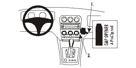 Figyelem! kérjük, olvassa el az összes utasítást és tanulmányozza a képeket, mielőtt a tartót rögzítené! 1. Nyissa ki a kesztyűtartót! Távolítsa el a ragasztócsík borítását a ProClip-ről! Nyomja a ProClip hosszú jobb oldali részét a résbe a kesztyűtartó és a műszerfal között! 2. A mellékelt réstágító keskeny végének segítségével tágítsa ki a rést a szabályzó-panel és a műszerfal között! Nyomja a ProClip bal oldali részét a réstágító fölötti résbe! 3. Húzza ki a réstágítót! Nyomja a ProClip bal oldali részét teljesen a résbe! 4. A ProClip a helyére került. |