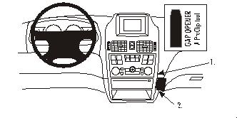 Figyelem! kérjük, olvassa el az összes utasítást és tanulmányozza a képeket, mielőtt a tartót rögzítené! 1. A mellékelt réstágító keskeny végének segítségével tágítsa ki a rést a műszerfal és a szabályzó-panelt körülvevő keret között! Távolítsa el a ragasztócsík borítását a ProClip-ről! 2. Nyomja a ProClip bal oldali részének íves peremét a réstágító alatti résbe! 3. Nyomja előre a ProClip jobb oldalát úgy, hogy a ProClip jobb oldali részének barázdált pereme bepattanjon a helyére a résben a szabályzó-panelt körülvevő műszerfal és a kesztyűtartót körülvevő műszerfal között! Húzza ki a réstágítót! 4. A ProClip a helyére került. |