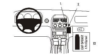 Kérjük, olvassa el az összes utasítást és tanulmányozza a képeket, mielőtt a tartót rögzítené! Nagyon fontos, hogy a ProClip-et pontosan a képeken látható módon helyezze el! 1. A mellékelt réstágítók keskeny végeinek segítségével tágítsa ki a rést a középső konzol-panel kerete és a konzol szegélye között! Távolítsa el a ragasztócsík borítását a ProClip-ről! Nyomja a ProClip bal oldalának szögletes peremét a résbe a rádió-berendezés és az ezüst színű kárpit között! 2. Tolja a ProClip-et jobbra úgy, hogy a bal oldali szögletes pereme beakadjon a rádió-berendezés mögé, ugyanakkor nyomja erősen előre a ProClip jobb oldalát úgy, hogy a szögletes pereme kerüljön a réstágítók közti résbe! 3. Addig nyomja, amíg érzékelhetően a helyére nem pattan! Húzza ki a réstágítókat! 4. A ProClip a helyére került. |
