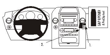 Figyelem! kérjük, figyelmesen olvassa el a használati utasítást és nézze meg az ábrákat, mielőtt rögzíti a ProClip-et! 1. A mellékelt réstágító keskeny végét nyomja a légbefúvót körülvevő panel kerete és a műszerfal párnázott része közötti résbe, hogy kitágítsa azt! Távolítsa el a ProClip ragasztócsíkjának borítását! 2. Tartsa a ProClip-et 45°-os szögben a műszerfalhoz képest, majd nyomja annak jobb oldali, ívelt szegélyét a réstágító felett a résbe! Ezzel egy időben húzza a ProClip-et a légbefúvó felé, és közben nyomja az ívelt szegélyt teljesen a résbe! Húzza ki a réstágítót! 3. Nyomja a mellékelt réstágító keskeny végét a légbefúvót körülvevő panel kerete és a központi konzol-panel közötti résbe, hogy kitágítsa azt! Nyomja a ProClip bal oldali részét erősen előre úgy, hogy annak szögletes szegélye teljesen a résbe kerüljön a réstágító felett! Húzza ki a réstágítót! 4. A ProClip a helyére került. |