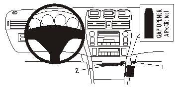 Figyelem! kérjük, figyelmesen olvassa el a használati utasítást és nézze meg az ábrákat, mielőtt rögzíti a ProClip-et! 1. A mellékelt réstágító keskeny végét nyomja a központi konzol oldalfalán található résbe, hogy kitágítsa azt! Távolítsa el a ProClip ragasztócsíkjának borítását! 2. Akassza a ProClip bal oldali részének szögletes szegélyét a konzol pereme és a rekesz ajtaja közötti résbe! (Megjegyzés: a rekesz ajtaja továbbra is szabadon nyitható marad. ) 3. Nyomja a ProClip jobb oldali részét erősen előre úgy, hogy annak szögletes szegélye bekattanjon a réstágító alatt a résbe! Húzza ki a réstágítót! 4. A ProClip a helyére került. |