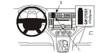 Figyelem! kérjük, figyelmesen olvassa el a használati utasítást és nézze meg az ábrákat, mielőtt rögzíti a ProClip-et! 1. A mellékelt réstágító keskeny végét nyomja a rádiót körülvevő keret és a légbefúvót körülvevő keret közötti résbe, hogy kitágítsa azt! Távolítsa el a ProClip ragasztócsíkjának borítását! 2. Nyomja a ProClip alsó, ragasztócsíkkal ellátott részét a réstágító mellett a résbe! Húzza ki a réstágítót! 3. Nyomja a réstágítót a légbefúvót körülvevő keret és a műszerfal közötti résbe! Nyomja a ProClip felső részének barázdált szegélyét a réstágító mellett a résbe! Húzza ki a réstágítót! 4. A ProClip a helyére került. |