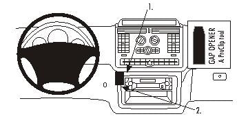 Figyelem! kérjük, figyelmesen olvassa el a használati utasítást és nézze meg az ábrákat, mielőtt rögzíti a ProClip-et! 1. A mellékelt réstágító keskeny végét nyomja a műszerfal és a központi panel közötti résbe, hogy kitágítsa azt! Távolítsa el a ProClip ragasztócsíkjának borítását! Igazítsa a ProClip-et az ábrán látható pozícióba! 2. Nyomja a ProClip felső részét a réstágító mellett a résbe! Húzza ki a réstágítót! 3. Nyomja a réstágítót a panel és a rádiót körülvevő keret közötti résbe! Nyomja a ProClip alsó részét előre úgy, hogy az teljesen a résbe kerüljön a réstágító mellett! Húzza ki a réstágítót! 4. A ProClip a helyére került. |