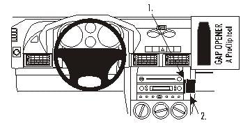 Figyelem! kérjük, figyelmesen olvassa el a használati utasítást és nézze meg az ábrákat, mielőtt rögzíti a ProClip-et! 1. A mellékelt réstágító keskeny végét nyomja a szabályzó-panelt körülvevő keret és a műszerfal közötti résbe, hogy kitágítsa azt! Távolítsa el a ProClip ragasztócsíkjának borítását! 2. Akassza a ProClip bal oldali, ragasztócsíkkal ellátott részét a szabályzó-panelt körülvevő perem mögé! 3. Nyomja a ProClip jobb oldali részét előre úgy, hogy annak szögletes, jobb oldali szegélye a beakadjon a réstágító felett 1-2 cm-rel a résbe! Nyomja a szögletes szegélyt a szabályzó-panel felé úgy, hogy teljesen a résbe kerüljön! Húzza ki a réstágítót! 4. A ProClip a helyére került. |