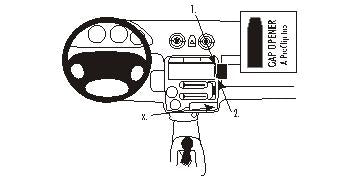 Figyelem! kérjük, figyelmesen olvassa el a használati utasítást és nézze meg az ábrákat, mielőtt rögzíti a ProClip-et! 1. Nyissa ki a hamutartót! Lazítsa meg a hamutartótól jobbra található csavart! A mellékelt réstágító keskeny végét nyomja a szabályzó-panelt körülvevő keret és a műszerfal közötti résbe, hogy kitágítsa azt! Távolítsa el a ProClip ragasztócsíkjának borítását! 2. Nyomja a ProClip bal oldali részének szögletes szegélyét a rádió és az azt körülvevő keret közötti résbe! 3. Nyomja a ProClip jobb oldali részét előre úgy, hogy annak szögletes szegélye beakadjon a réstágító felett a résbe! Húzza ki a réstágítót! Húzza meg a hamutartótól jobbra található csavart! 4. A ProClip a helyére került. |