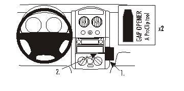 Kérjük, olvassa el az összes utasítást és tanulmányozza a képeket, mielőtt a tartót rögzítené! 1. A mellékelt réstágítók keskeny végeinek segítségével tágítsa ki a rést a középső konzol-panel kerete és a párnázott műszerfal között! Távolítsa el a ragasztócsík borítását a ProClip-ről! 2. Nyomja a ProClip jobb oldalának barázdált peremét a résbe a réstágítók között! Addig nyomja, amíg érzékelhetően a helyére nem pattan! Húzza ki a réstágítókat! 3. Nyomja a réstágítót a résbe a klíma-szabályzó panel és az aprótartó doboz között! Nyomja erősen előre a ProClip bal oldalát úgy, hogy a bal oldali barázdált pereme kerüljön a réstágító melletti résbe! Addig nyomja, amíg érzékelhetően a helyére nem pattan! Húzza ki a réstágítót! 4. A ProClip a helyére került. |