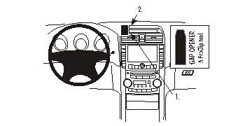 Kérjük, olvassa el az összes utasítást és tanulmányozza a képeket, mielőtt a tartót rögzítené! 1. A mellékelt réstágító keskeny végének segítségével tágítsa ki a rést a középső konzol-panel kerete és a műszerfal között! 2. Távolítsa el a ragasztócsík borítását a ProClip-ről! Helyezze a ProClip alsó részének szögletes peremét a légbefúvóba! 3. Nyomja erősen előre a ProClip felső részét úgy, hogy a szögletes pereme kerüljön a réstágító melletti résbe! Addig nyomja, amíg érzékelhetően a helyére nem pattan! Nyomja lefelé a ProClip tetejét a lehető legjobb tapadás érdekében! Húzza ki a réstágítót! 4. A ProClip a helyére került. |